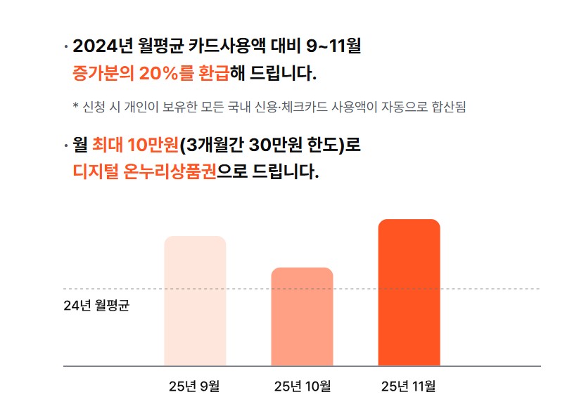 상생페이백은 국민이 일정 기준보다 많이 소비한 금액의 20%를 환급(캐시백) 해 주는 제도입니다. 환급은 디지털 온누리상품권으로 지급되며, 월 최대 10만 원, 3개월 동안 최대 30만 원까지 받을 수 있습니다.